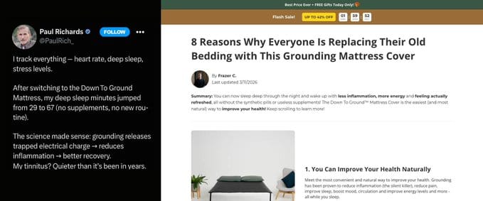 DownToGround: Ad vs. Landing Page — The ad is a UGC-style tweet: "My deep sleep minutes jumped from 29 to 67" — one person's data, selling the result. The landing page shifts to authority: "8 Reasons Why Everyone Is Replacing Their Old Bedding" — editorial proof, mechanism explanation, multiple reasons.