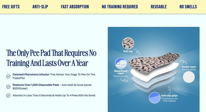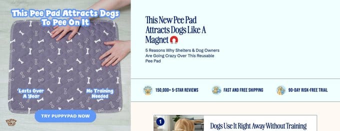 PuppyPad — Three proof signals right below the headline: "150,000+ 5-Star Reviews" + "Fast and Free Shipping" + "90-Day Risk-Free Trial." These aren't selling the product. They're giving reasons to trust the product.
