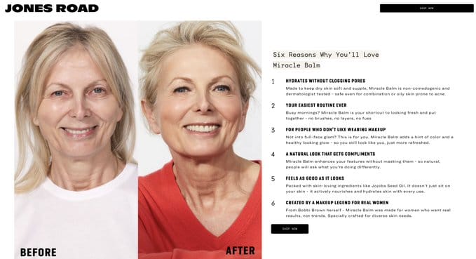 Jones Road — "Six Reasons Why You'll Love Miracle Balm." Before/after on the left, numbered reasons on the right. Each reason is a specific benefit — "Hydrates Without Clogging Pores," "Your Easiest Routine Ever" — and each variant emphasizes different reasons for different audiences.