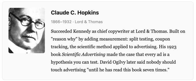 His 1923 book “Scientific Advertising” made the case that every ad is a hypothesis you can test. David Ogilvy later said nobody should touch advertising "until he has read this book seven times."