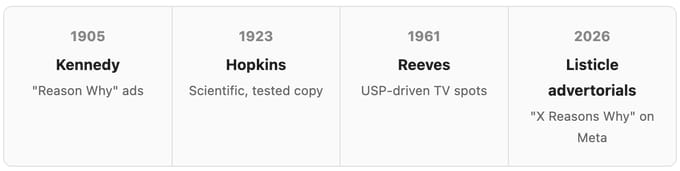 The listicle advertorial isn't a new format. It's the oldest idea in advertising — "reason why" — refined through 121 years of testing and now running at scale on Meta. The numbered list is just the most natural container for multiple reasons. The mechanism is just a named "reason why." The proof stack is just evidence that the reasons are true. The segmented variants are just different reasons for different people.