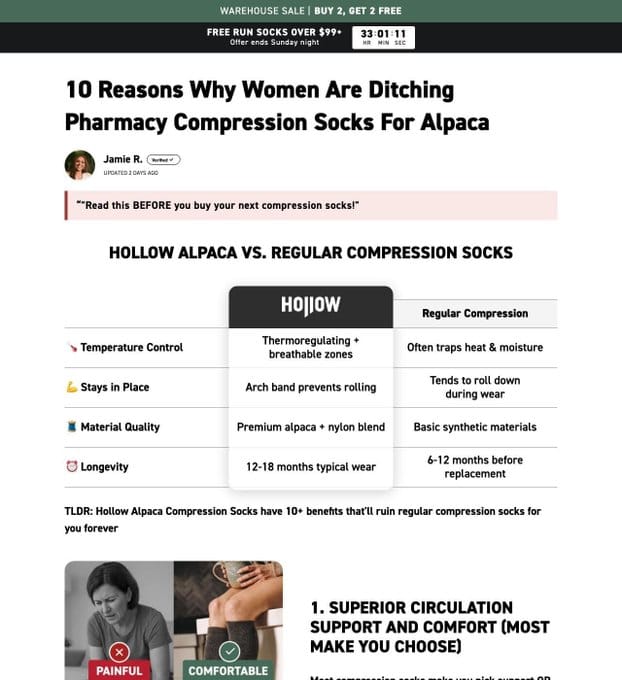 HollowSocks does the same with gendered variants: men's and women's versions of "10 Reasons Why." The USP (alpaca is better than synthetic compression) stays the same. The specific reasons — which benefits get emphasized, which pain points get agitated — shift per audience.