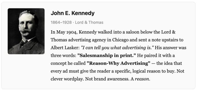 Before Kennedy, most advertising was decorative. Pretty slogans. Clever rhymes. Kennedy's insight was radical: an ad is not entertainment. An ad is a salesman making a case. And a salesman doesn't just say "buy this." A salesman says why.
