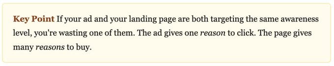 Across all 25 pages, we found the same pattern: the ad targets a lower awareness level than the landing page.