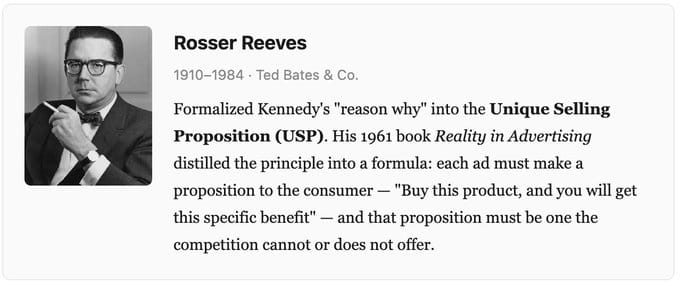 Rosser Reeves formalized Kennedy's "reason why" into the Unique Selling Proposition (USP).