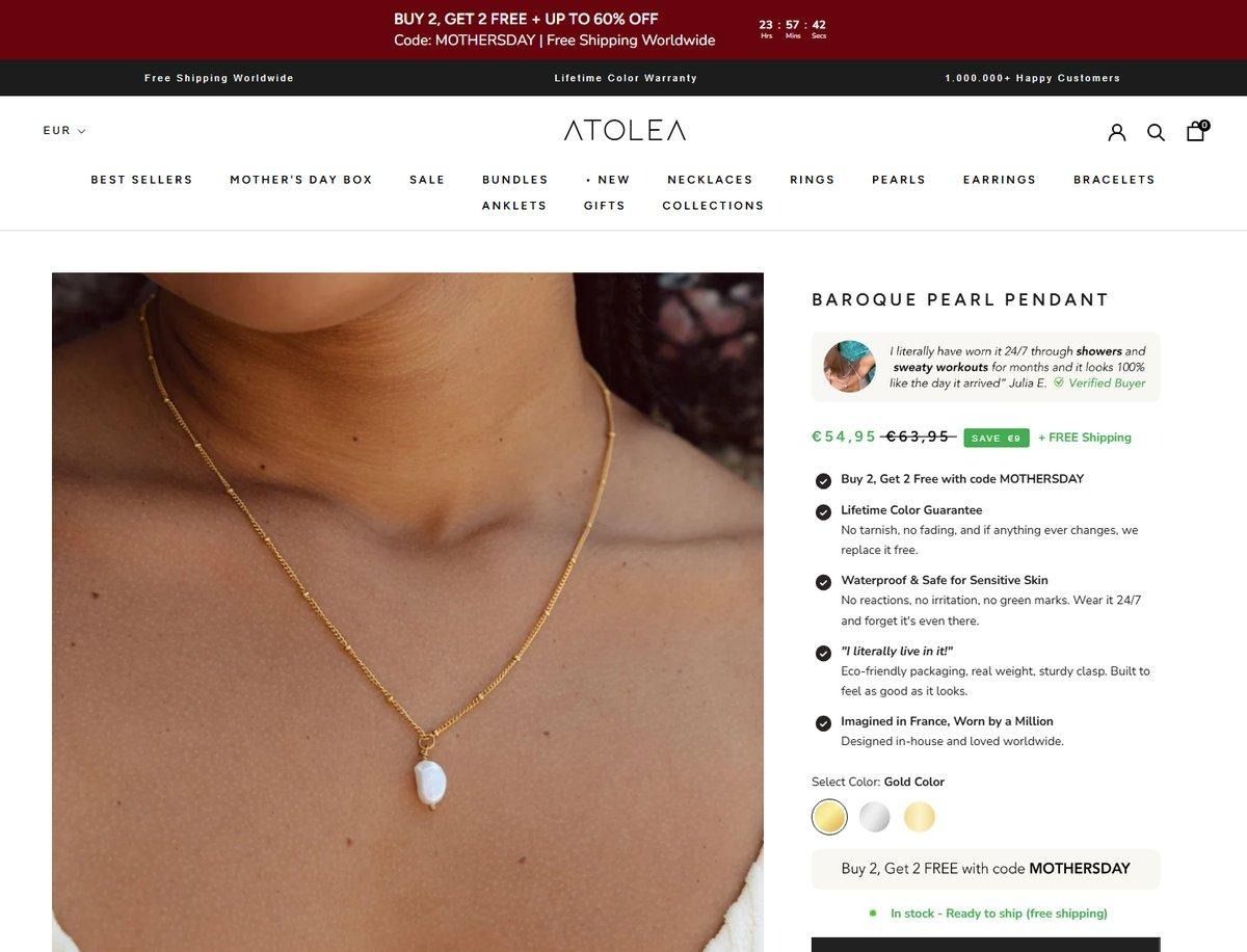 For context, most jewelry brands we analyze hedge their positioning. A little luxury, a little accessible, a little trendy, a little classic. They try to be everything to everyone because they're afraid of narrowing the market. Atolea narrowed aggressively. They picked one customer (the woman who hates taking jewelry off) and one promise (jewelry that stays on) and built everything from there.