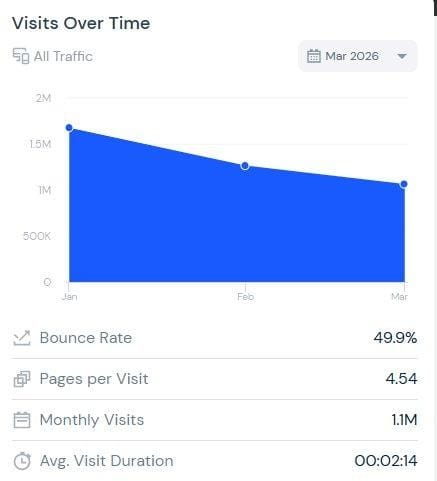 SimilarWeb traffic overview showing 1.1M monthly visits, March 2026