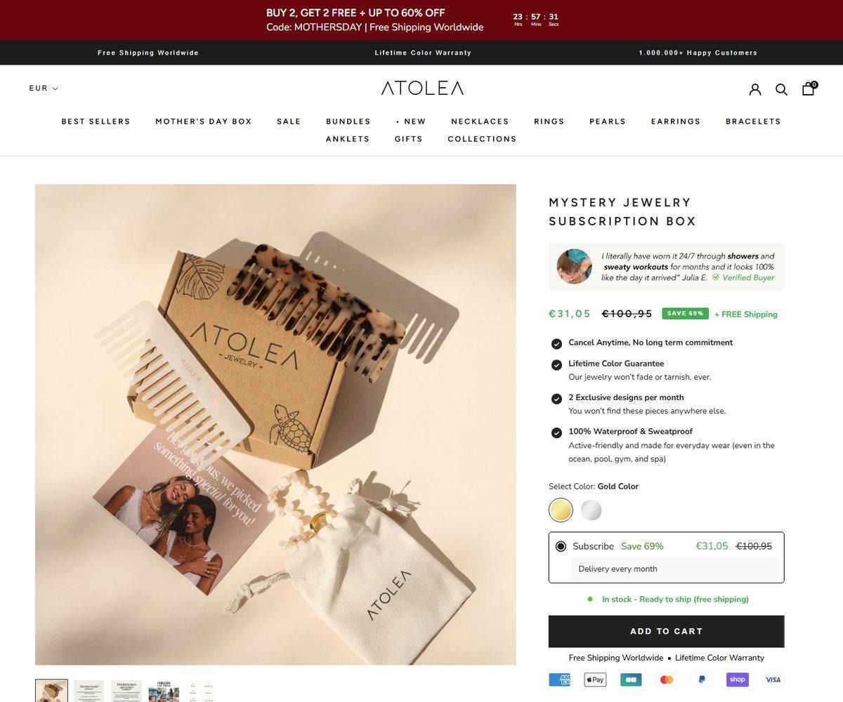 Atolea mystery box subscription page showing $39.99/month offer